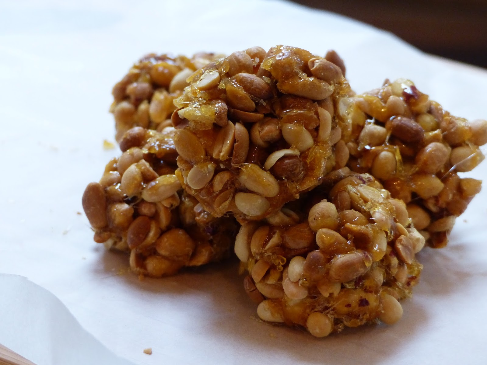 Roasted groundnuts mixed with caramelized sugar, hardened into crunchy bars. A common childhood snack in Ghana.